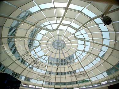 FSS卷轴式天棚帘,即单电机弹性机构天棚帘,该系统专为水平或倾斜遮阳系统而设计,适合于弯曲、倾斜或水平的玻璃天棚。主要由管状电机和弹性张力系统组成,面料一直经受张力,机构一端用一个管状系列马达,另一端弹簧机构。