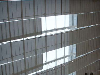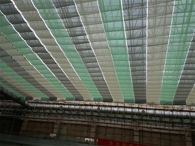 FCS天棚帘收拢时呈折叠式,展开时呈波浪形。FCS天棚帘系统主要由传动机构、面料和控制系统三部分组成。由于该机构张力较小,可选用普通卷帘面料。遮阳面料如波浪般的整齐地伸展在采光屋顶,面料层层折叠中体现出强烈的立体感,给人视觉上强烈的艺术冲击,是目前使用较多的天棚帘遮阳系统。